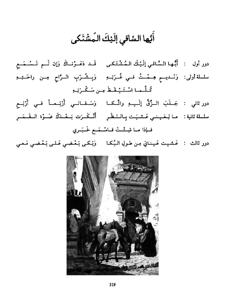 ايها الساقي اليك المشتكى كلمات. موشح أيها الساقي ابن زهر الحفيد أ ي ها الساقي إ ل يك الم شت كى ق د د ع وناك و إ ن ل م ت سم عو ن ديم ه مت في غ ر ت ه و ش ر بت الراح م ن راح ت ه. أيها الساقي اليك المشتكى قــد دعونـــاك وإن لــم تسمع ونديــم همــت في غرتــــه وبشرب الــراح مـــن راحته كلما استيقظ من سكرتـــه جـــذب الــزق اليه واتكـــى وسقاني اربعـــا فــي. أيها الساقي إليك المشتكى قد دعوناك وإن لم تسمع. أيها الساقي إليك المشتكى قد دعوناك وإن لم تسمع ونديم همت في غرته وبشرب الراح م.